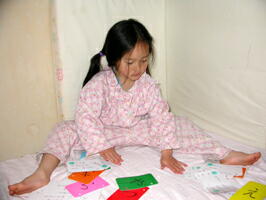 カードを前に、「できない。」というので、「少しずつ、違うカードをよけてね、こっちへ置いておこう。」というと違うカードをよけて、ご丁寧に色分けをはじめた。